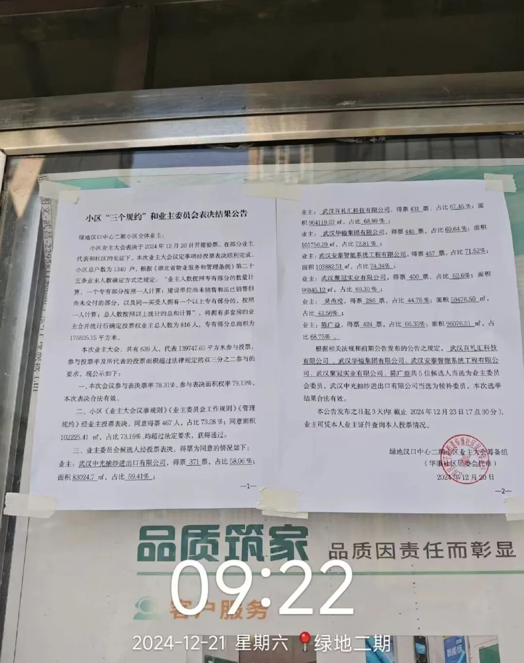 后来有业主通过一些渠道进行曝光,7月20日塔子湖街道办与派出所现场责令投票活动暂停,相关人员和物品离场。即便如此业委会仍在次日继续安排电话邀约投票,并于7月22日仓促发布表决结果公告,宣称"558位业主参与投票,投票权总业主778人,参与率71.72%"。