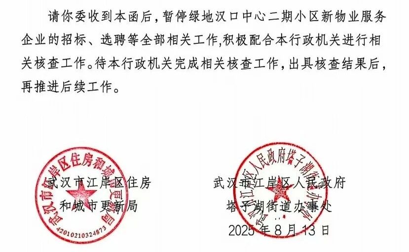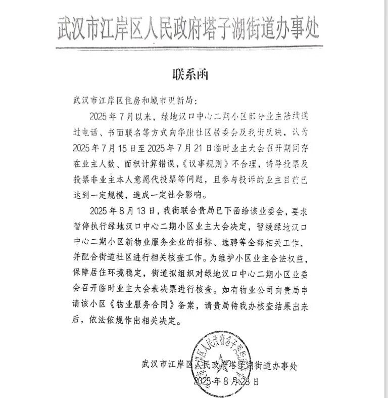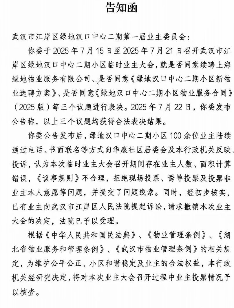 武汉塔子湖街道办迅速联合区住更局介入,8月13日,双方共同向该小区业委会下发《告知函》,明确要求暂停执行业主大会决定,并暂缓新物业服务企业的招标、选聘等全部相关工作,同时要求业委会配合街道与社区的核查。